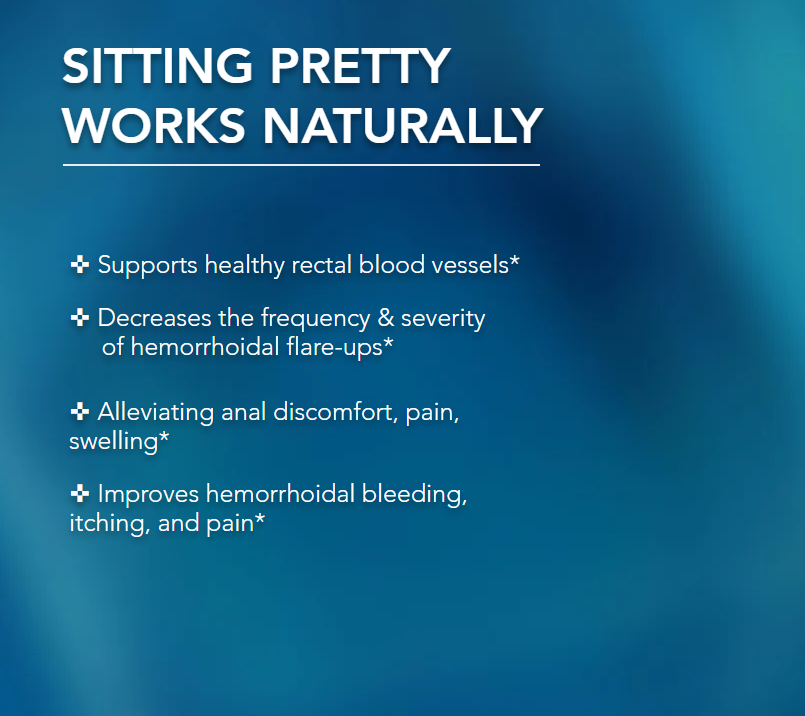 - NO MORE MESSY CREAMS THAT ONLY TREAT SYMPTOMS. Sitting Pretty relieves your Hemorrhoids by addressing what causes them internally. It works by reducing inflamed blood vessels while strengthening your veins.